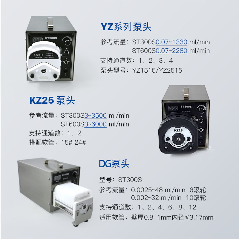 YZ1515泵頭:13# 14# 16# 19# 17# 18# 25#軟管,參考流量范圍0.07-1330(ml/min),支持通道數1/2/3/4