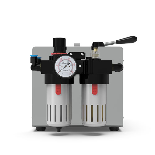 把外接氣源的連接管插入快速【氣源接口】, 調節【調壓閥】, 使壓力達到工作指標, 在【油杯】中加入壓縮空氣專用油
